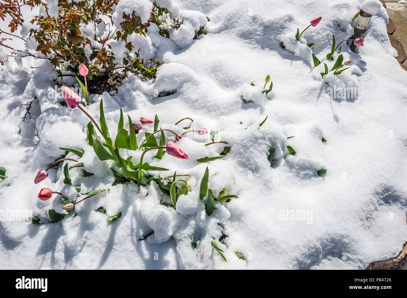 Description: Spunky pink tulips proving they can survive a spring snow Stock