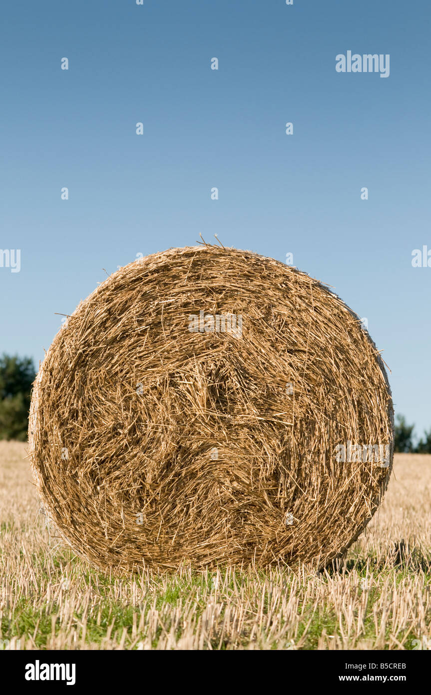 Description: Big round bales of straw in a field autumn afternoon blue sky
