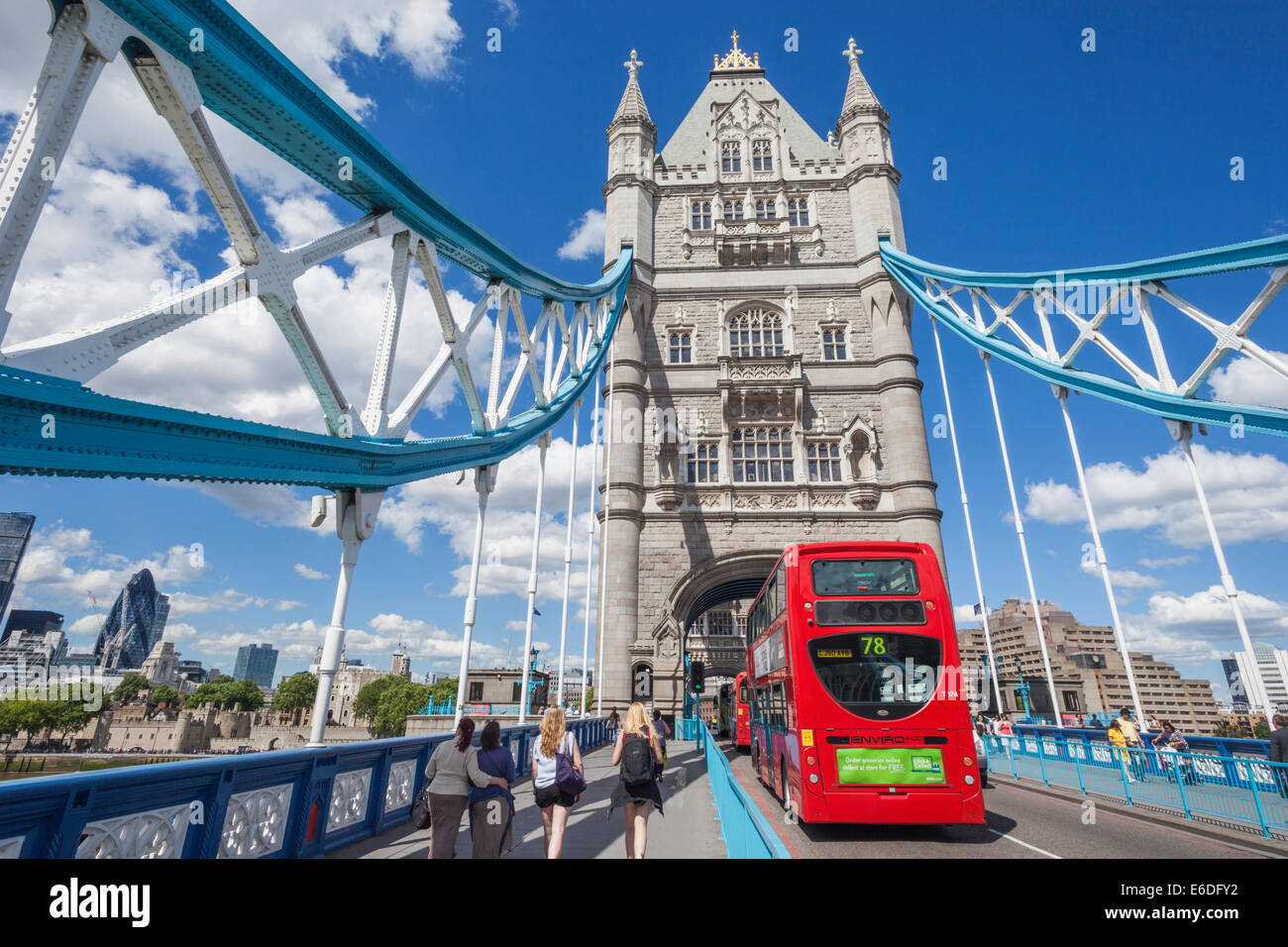 Red double decker bus on the Tower Bridge Southwark London Stock